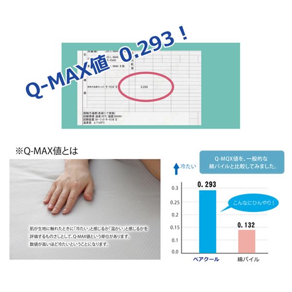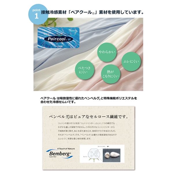 表生地に旭化成せんいの冷感素材「Paircool」を使用。ペアクールは吸放湿性に優れたベンベルグと特殊機能ポリエステルを合わせた冷感繊維です。柔らかく、ベタつきにくい、熱がこもりにくく、ムレにくいなどの特長があります。肌が生地に触れたときに「冷たい」と感じるか「あたたかい」と感じるかを評価するものさしとしてQ-MAX値という単位があります(数値が高いほど冷たい)。本商品はQ-MAX値0.293です。エアコンが苦手な方でも快適に。節電、節約にもつながる商品です。ゴム仕様なので装着も簡単です。ご家庭の洗濯機で洗える(ネット使用)ので清潔にご使用頂けます。同じペアクールシリーズは他に敷きパッド、キルトケット、枕パッド、フィットシーツの取り扱いもあります。