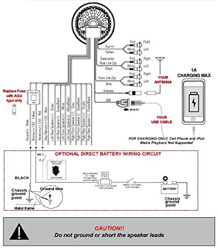 - Inputs: USB Audio, USB Charging, AUX-in (Rear) Compatible with Audio out from Smartphones and MP3 Players. Outputs: Front Pre-Amp, Rear / Sub