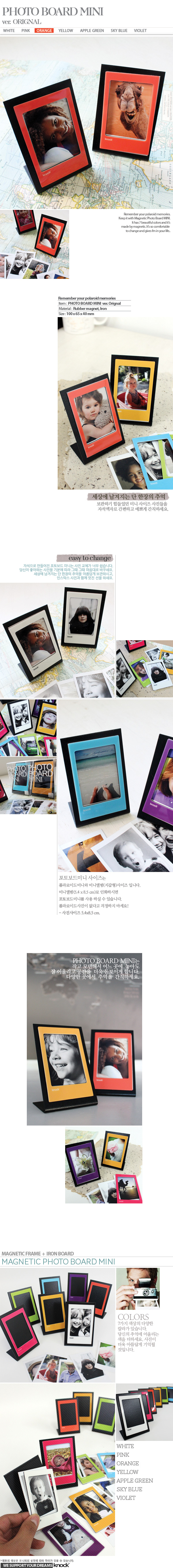 폴라로이드미니용 액자입니다. 프레임 뒷면에 고무자석을 적용하여 쉽게 금속보드에 붙이거나 띨 수 있어 사진교체가 아주 간편하다는 것이 특징입니다. 또 한 추가로 다양한 색상의 프레임 구입이 가능하여 사진에 분위기에 따라서 바꾸어 보실 수 있습니다.