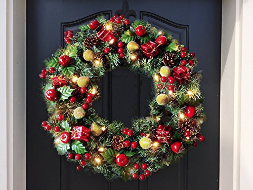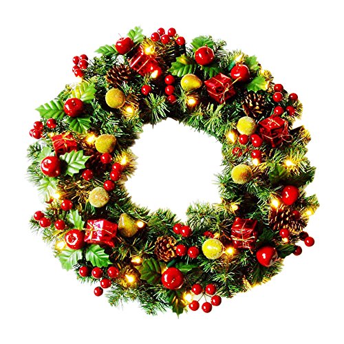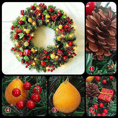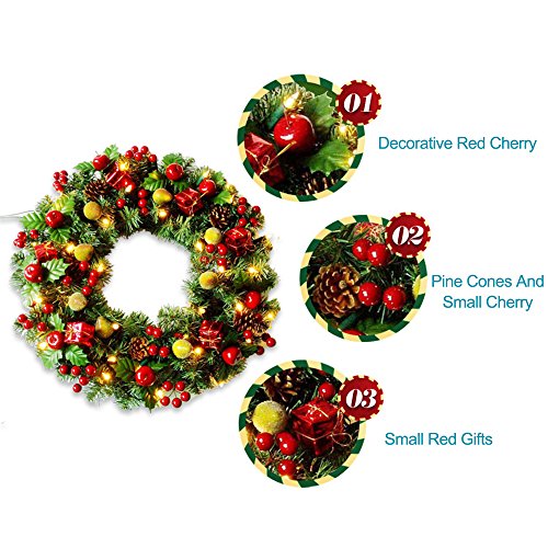 ElementDigital Christmas Wreaths with LED Lights Pre-lit Wreath Green Bristle Pine Needles Red Cherry Gifts Fruits Ornaments for Front Door Window Fireplace Home Decoration 19.5 inch