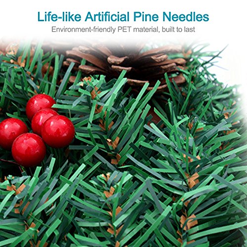 BUILT TO LAST: Our festive Christmas Wreath is made of a full wreath base with life-like artificial pine needles and lovely decorations of pine cones, red cherries, fruits and small red gifts. The wreath is finished with a lovely bow. It will add a touch of fashioned Holiday charm!