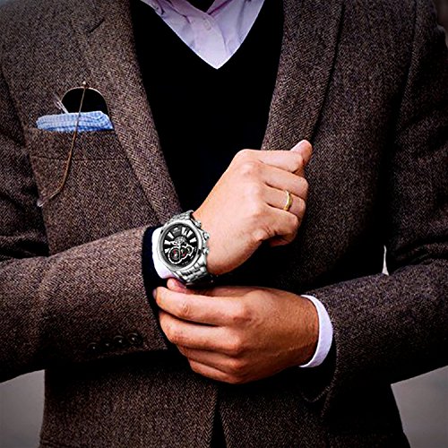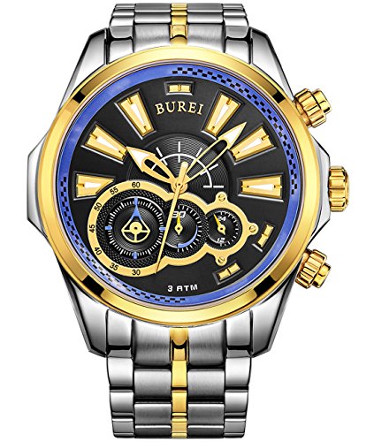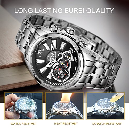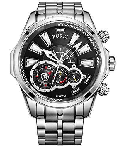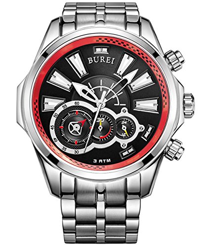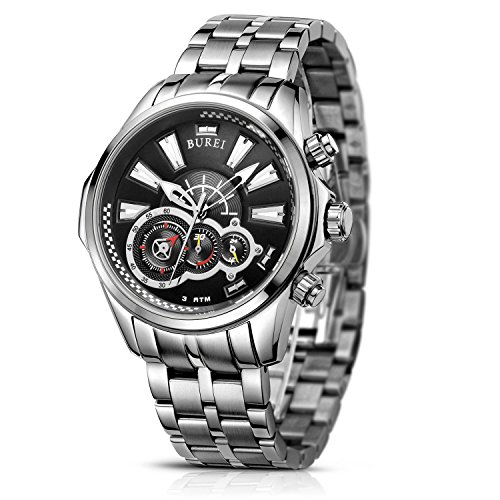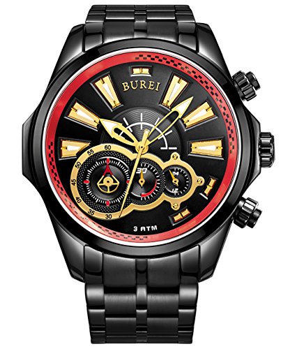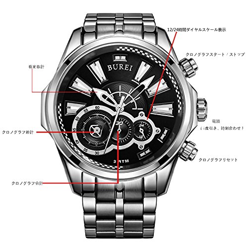 (《바오쇼》)BUREI맨즈 손목시계 야광 지침 크로노 스테인레스 손목시계 팔찌 블랙 문자판 흑적 있어 테두리