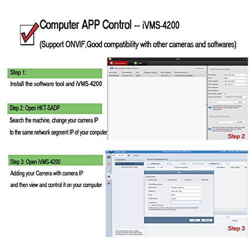 APP & Software Support , ONVIF Support-- 1)Quick WiFi Setup via iPhone or Android Smartlink using the App (Included). Seamlessly Stream Video Directly to Your Smartphone, Tablet, Apple Mac or Windows PC. 2) Easily view and control the camera on PC website. 3)Support Hivision iVMS-4200 Software(Included), support Blue Iris. Easily view and control. No reason to return within a month, free maintenance within 1 year. Please view the file in the CD before you install the camera.