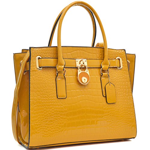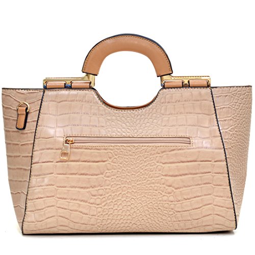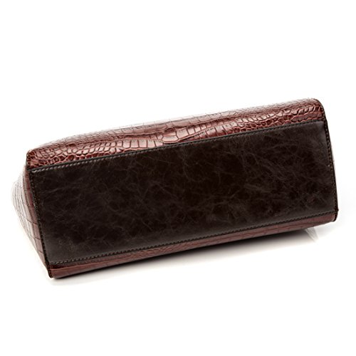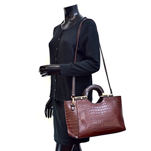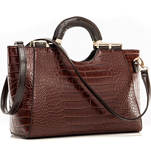 -. Feature : High Quality Faux Croc, Fabric Interior / Exterior Back Wall Zipper Pocket, Interior Back Wall Zipper Pocket, Interior Open Top Item Pockets / Croc Textured Faux Leather, Top Zip Closure, Rolled and Stitched Faux Leather Handles, Removable Shoulder Strap, Flat Bottom, Deep Chocolate Fabric Interior, Matching Gold Tone Zipper Pulls, Accents and Rings / Approx. Size: 15"W x 9"H x 4.25"D, Strap Drop Length: 3.5" / If on trend fashion with unique details are your signatures, then this bag is for you! This lightly winged shoulder bag with faux leather covered metal handles adds dramatic elegance to any outfit. With removable shoulder strap, flat bottom design and lovely deep chocolate, fabric interior rounding off the heavenly details, this is one bag that makes the top of the list as an everyday favorite!