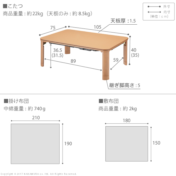 ●天板:幅105x奥行75cm・厚み15mm・約8.5kg