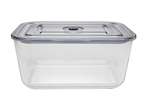 - Glass base with simple push-button lid makes sealing easy