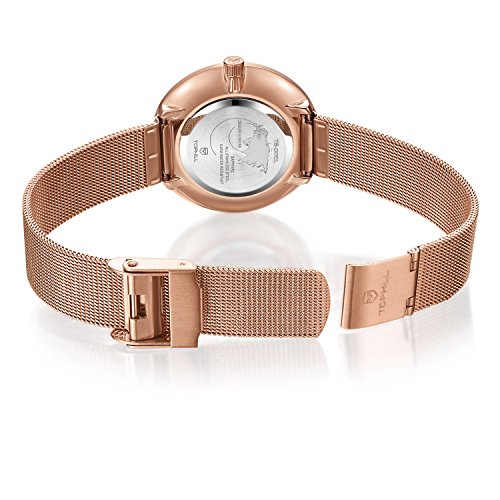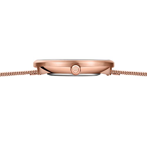 Rose gold case and mesh band with hook clasp.