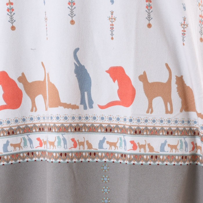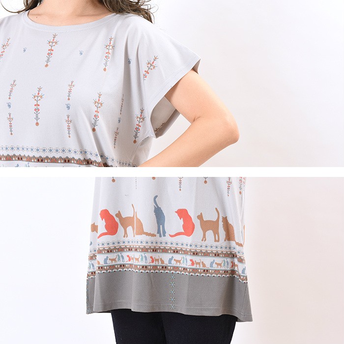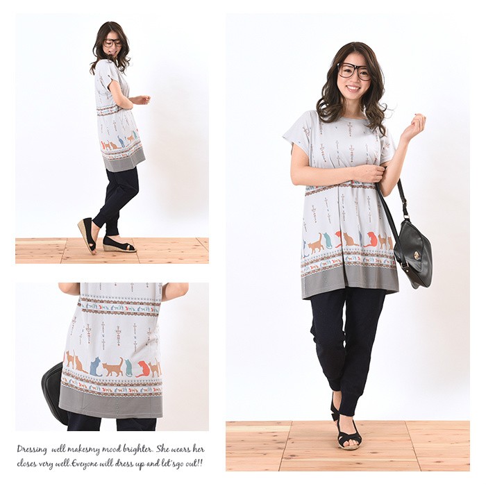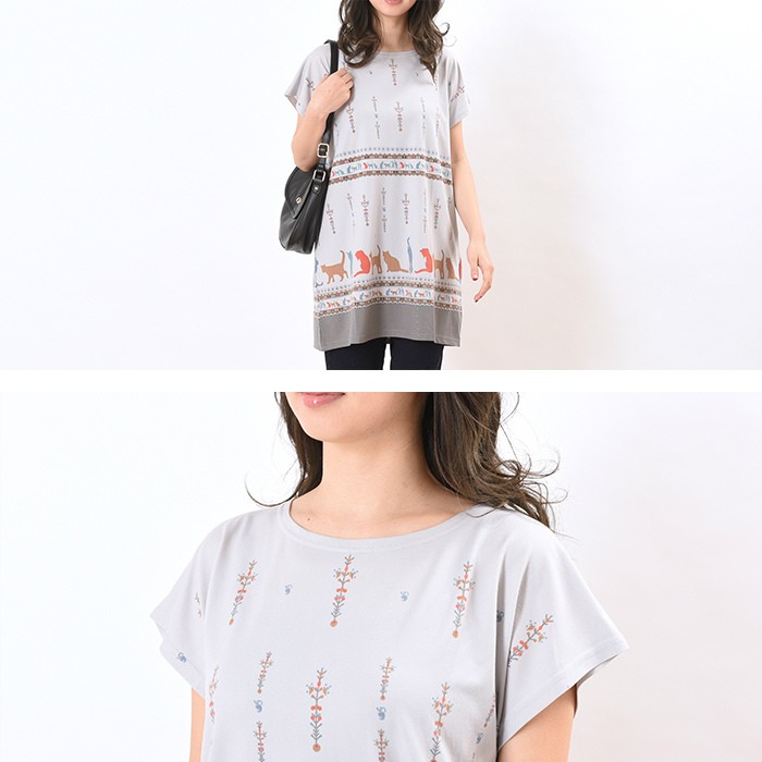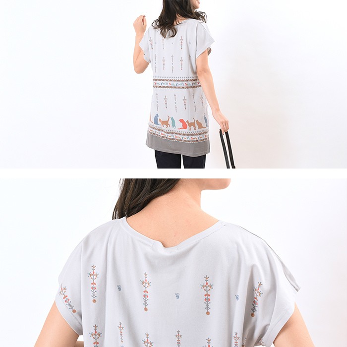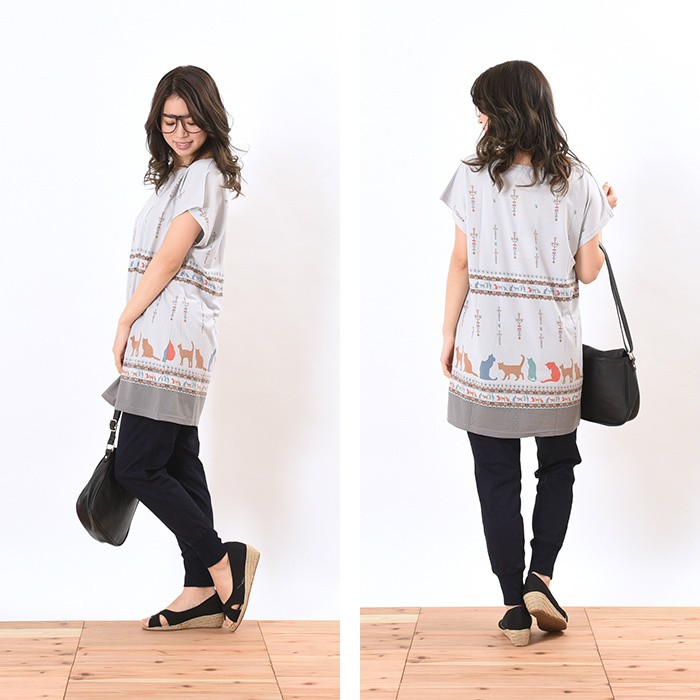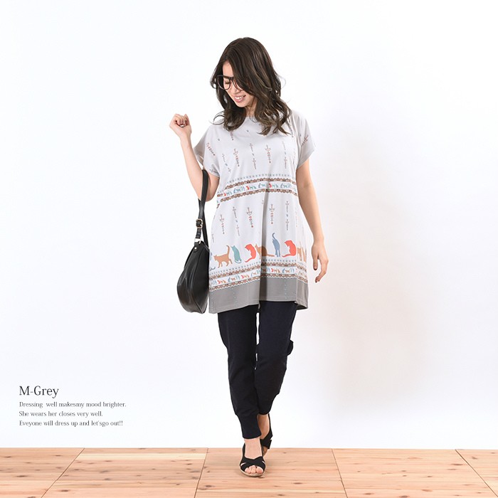 しっかりとした生地感のピーチ素材のチュニックです。インパクト満点でオシャレな雰囲気のあるネコちゃん柄は、シンプルなボトムスやアウターと相性抜群でコーディネートのポイントになること間違いなしです♪ネコ好きにはたまらない、ネコちゃんの様々な姿がプリントされていて、見ているだけでも幸せになれそうなデザインです。Mサイズ Lサイズ