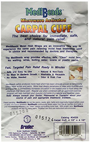 -. Binding : Health and Beauty -. Brand : Medibeads -. Color : White with Green Trim -. EAN : 0041533345206 -. Feature : Washable & Reusable / Safe & Easy to Use. Simply Microwave and apply to the site of pain. / Ready in minutes for a unique, at-home, moist heat treatment. / Self-hydrating. No need to ever add water. MediBeads unique patent-pending design absorbs water molecules from the air to provide moist heat. / Will not support bacteria or fungal growth like grain products making them a superior, odor-free choice. -. IsAdultProduct : 0 -. Label : Bruder Healthcare -. Manufacturer : Bruder Healthcare -. Model : 34520 -. MPN : 230-4525 -. PackageQuantity : 1 -. PartNumber : 230-4525 -. ProductGroup : Health and Beauty -. ProductTypeName : HEALTH_PERSONAL_CARE -. Publisher : Bruder Healthcare -. Size : 4.5" x 4.5" -. Studio : Bruder Healthcare -. Title : MediBeads Moist Heat Carpal Cuff -. UPC : 041533345206