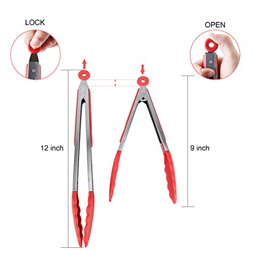 Pull Ring Lock & Unlock & Hanging Loop: This kitchen tongs set has locking mechanism, pull the ring for lock and push for unlock, super easy operation. Hang them with the hanging loop after use or put in the drawer by pulling the ring to lock it, space saving.