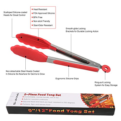 Kitchen Tongs,S-JIANG 9" and 12 " Heat Resistant Cooking Tongs Stainless Steel Kitchen Cooking Silicone Food Tong Tips Salad Tongs for BBQ,Salads,Grilling,Serving and Fish Turning,Black