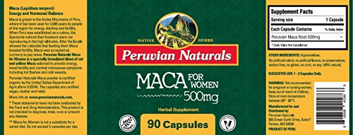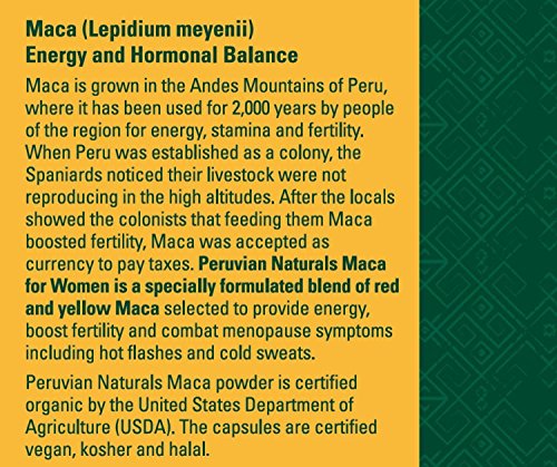 Peruvian Naturals Maca for Women is a specially formulated blend of gelatinized red and yellow Maca selected to provide energy, boost fertility and combat menopause symptoms including hot flashes and cold sweats.
