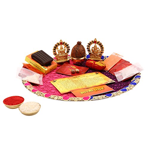 - Package Contains: 1 Decorated Pooja Thali, 1 Idol of Ganesh Ji, 1 Idol of Laxhmi Ji, 1 Pouch of kumkum, 1 pouch of Sindoor, 1 pouch of Akshat, 1 aarti book, 1 prarthna book, 1 packet of dhoop, 1 shreefal, 1 mouli bundle, 1 packet of mishery, 1 betalnut, 1 kalash, 2 containers.