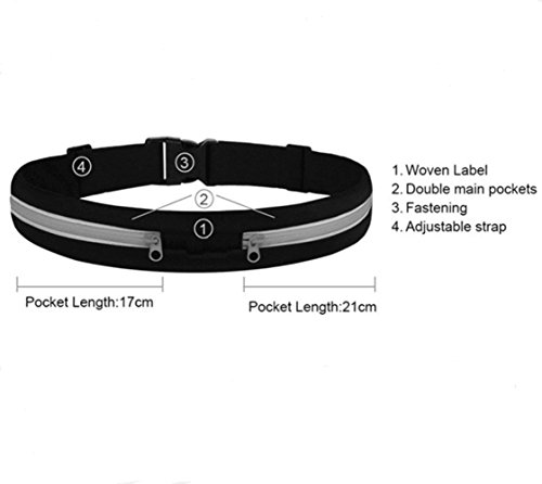 Two pockets design,sweat proof + rain-proof + dust-proof +dirt proof and scratches + Washable , Elastic Straps Adjustable Belt fits Both Large and Small Wais