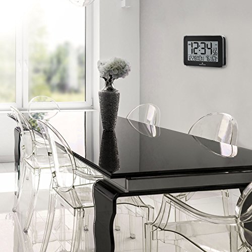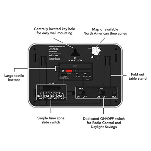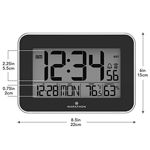 This Marathon atomic clock is self-adjusting and self-setting, eliminating the need to manually input the time and date. Simply insert the batteries provided with the clock and it will synchronize to the time set out by the atomic clock in Colorado once the signal is received. The clock includes all 8 North American time zones - a worldwide exclusive Marathon clock feature! It can be used anywhere within the North American continent and Hawaii. Choose from Pacific, Mountain, Central, Eastern, Atlantic, Newfoundland, Alaska and Hawaii standard time. The time and date can easily be set manually for those using the clock outside of North America and Hawaii. Daylight Savings Time on/off option is included. The clock's elegant, transparent, acrylic outer frame and large numbers making this beautiful clock ideal for home, office, school, hospital, etc. It easily hangs on a wall or can be placed on a table top using the sturdy fold-out stand. Split-second accuracy shows the time in either AM/PM format or 24-hour military timing, along with the month, weekday and date, as well as indoor humidity and room temperature in Celsius or Fahrenheit.Feature