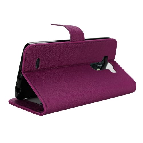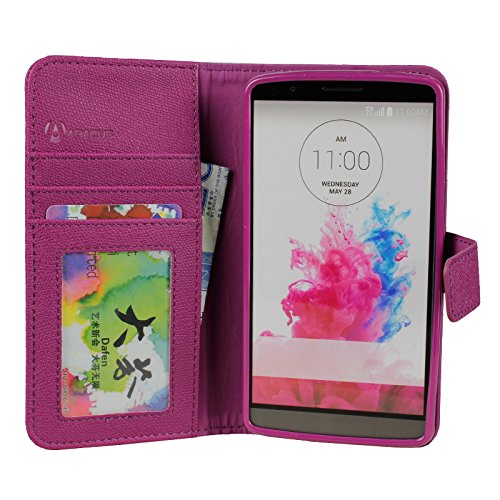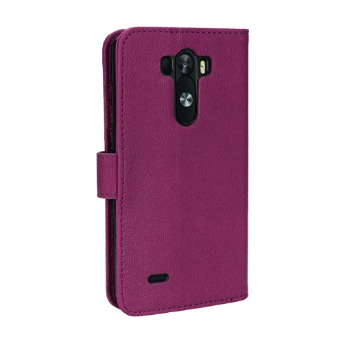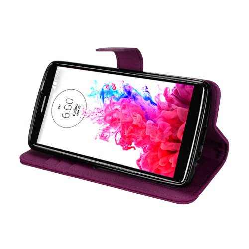 - Feature : Synthetic Leather Purple Wallet Case for LG G3 Cell Phone / Two layers of Protection - Leather Flip Cover and Snap-on Back Cover / Folding Stand Case for watching Media or Video chat / Folio style with 3 Slots for Credit & ID Cards and a Pocket for Cash / Perfect fit for LG G3, held closed by an invisible Magnetic clasp