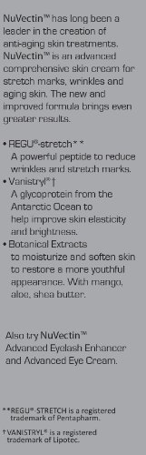 It's no wonder lines and wrinkles are the #1 skin aging concern. They start out small and the next thing you know, they've deepened - it happens to everyone. Now you can fight them. NuVectinTM is the most effective anti-wrinkle treatments and anti-aging creams out there. Value Alternative to StriVectin SDTM...at a fraction of the cost. NuVectinTM is an intense concentrate that is a super-charged comprehensive skin repair cream for stretch marks, wrinkles and aging skin. This leading wrinkle and stretch mark fighter is now powered up with a new clinical formula for even greater results. More Science. Less Wrinkles. NuVectinTM is an advanced comprehensive skin cream for stretch marks, wrinkles, and aging skin. The new and improved formula brings even greater results. REGU®-stretch is a powerful peptide to reduce wrinkles and stretch marks. Vanistryl® is a glycoprotein from the Antarctic Ocean to help improve skin elasticity and brightness. Botanical extracts to moisturize and soften skin to restore a more youthful appearance. With mango, aloe, & shea butter.Feature