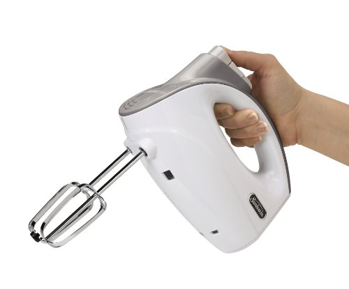 Delight family and friends with homemade cakes or muffins with help from this easy-to-use mixer. Whether celebrating a birthday, hosting a book group, or gathering with friends at a potluck, this versatile mixer will help prepare batch after batch of delicious treats quickly and easily. As a stand mixer it's light (weighs less than 10 pounds) so it's easy to pull out and to store. And, with the press of a button, the stand mixer converts to a hand mixer. This multipurpose five speed mixer delivers strong mixing results with 250 watts of motor power. The durable 3-quart stainless steel bowl easily removes from the base for clean-up. Includes two chrome beaters and two dough hooks.Feature