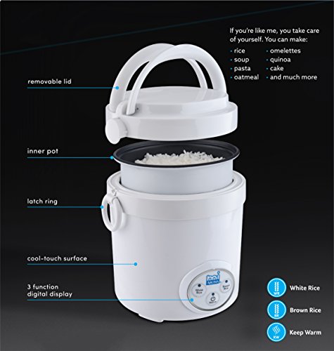A meal for you or a meal for two? It's minimalist. It's mini. It's mi. Have a meal with mi or invite a friend. mi AROMA mini rice cooker makes more than rice with digital controls of White and Brown Rice for precise and delicious results. It also makes cake, soup, pasta, omelettes and so much more with just the right recipes! It's mini, portable, quick and compact. If you're like mi you take care of yourself. Whether it’s soup when you're sick, dessert when you're in love or anything in-between. With mi, the focus is on you.Feature