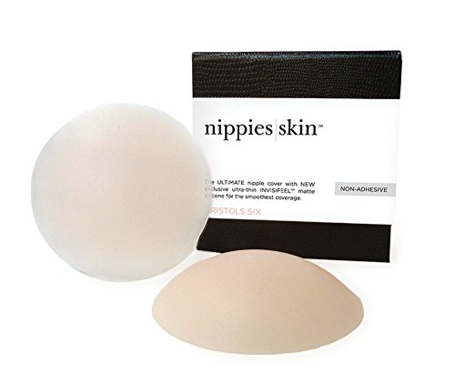 Product Description Bristols 6's bestselling nipple cover for natural, skin-like coverage has been improved - introducing NEW Nippies Skin with exclusive Invisifeel (TM) silicone technology! Nippies Skin, a revolutionary ultra-thin matte silicone nipple cover for the smoothest invisible coverage possible. Alternative silicone covers are thick, creating telltale ridges and 'puffy' looking nipples. Blending seamlessly into your skin, Nippies Skin's new advanced ultra-thin and soft Invisifeel (TM) silicone with tapered edges is undetectable when worn. Other silicone intimates are encased in a shiny film that wrinkles and shows camera flash, whereas the exclusive matte finish on Nippies Skin is 'paparazzi proof' to prevent reflecting light through clothing. Two semi-transparent colors, light and dark, blend into multiple skin tones. Washable and reusable adhesive and non-adhesive versions. Packaged in a chic, travel-size faux-crocodile skin compact for women on the go. This practical intimate creates a smooth, seamless profile under plunging necklines, tanks, sheers, lingerie, swimsuits, and active wear. Wear at the office, gym, out at night, and special occasions like prom and weddings. The adhesive version is best worn in place of a bra. Washable and reusable hypoallergenic medical grade adhesive adheres to and shapes breasts. Recommended for smaller breasted women who don't want to wear a bra. The non-adhesive version forms to curves using body heat and light suction, and is best worn tucked into bras or camisoles. Attain a smooth silhouette without bulky padding or layers under clothing. Created for larger chested women who need extra coverage under their unpadded bras and women with adhesive sensitivity. Bristols 6's celebrity fans include Rihanna, Jennifer Aniston, Giuliana Rancic, Lady Gaga, and Rachel Bilson. As seen in People designWatch, Glamour, Nylon, Star, Daily Candy, Indesign, and TV's 'The Rachel Zoe Project.' 0