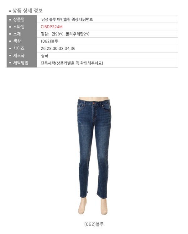 남성용 블루 어반 슬림 데님 진 입니다 26 사이즈와 36 사이즈 까지 나오기때문에 마르신 체형분들도 편하게 착용하실수 있습니다