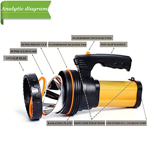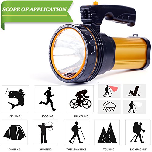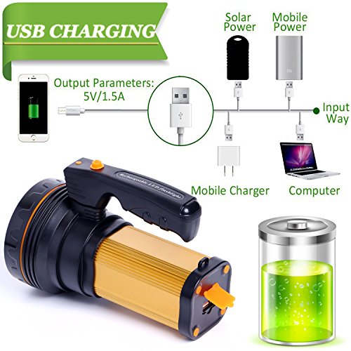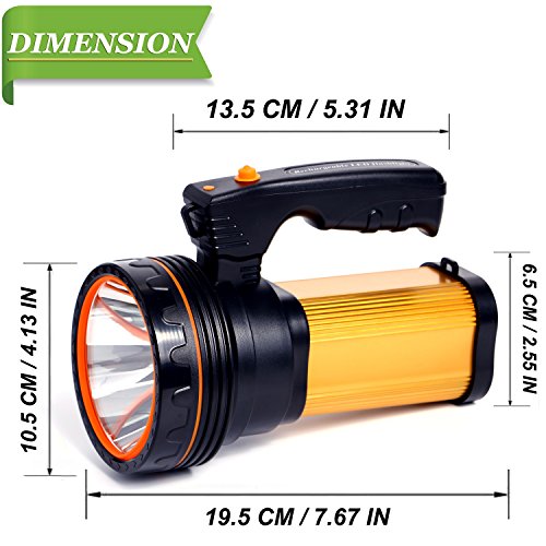 NOT ONLY SEARCHLIGHT : The USB output port at the bottom of the flashlight,it can serve as a power bank for your smartphone or mobile devices in emergency. Huge Battery capacity up to 9000mAh. RECHARGEABLE/HIGH INTENSITY