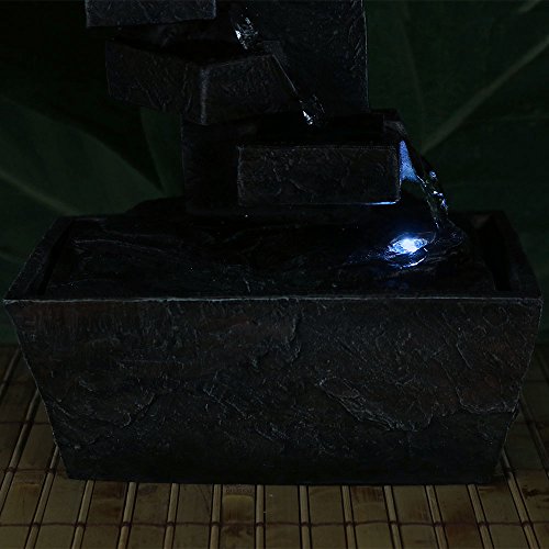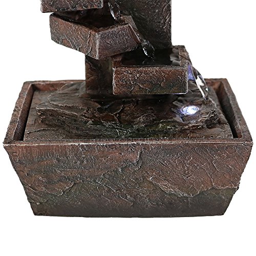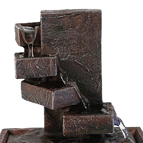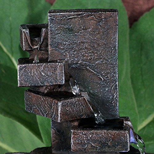 - Small indoor multi-level spiral staircase tabletop waterfall water fountain featureThis indoor tabletop water fountain is the epitome of soothing Zen. You can easily enjoy the ambiance of a water feature without the harsh sounds as water quietly flows from the top level of the fountain and travels down four "steps" to the basin where it recirculates through the fountain via a submersible electric pump. The soothing shades of clay red, gray and white swirl together to create a uniquely serene masterpiece.