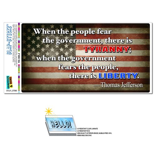 -. Brand : Graphics and More -. Feature : Premium quality 7.6"(W) x 4.0"(H) Graphics and More SLAP-STICKZ(TM) sticker / Printed with water and UV resistant inks to resist fading indoors or out / Includes glossy top laminate film for maximum durability / Special material allows trapped air to escape for easy bubble-free application / Standard shipping to U.S. destinations is free and includes tracking -. Label : Graphics and More -. Manufacturer : Graphics and More -. ManufacturerPartsWarrantyDescription : Parts -. MPN : STL01_07590 -. PackageQuantity : 1 -. PartNumber : STL01_07590 -. ProductGroup : Automotive Parts and Accessories -. ProductTypeName : AUTO_ACCESSORY -. Publisher : Graphics and More -. Studio : Graphics and More -. Title : When the People Fear Government There is Tyranny - Thomas Jefferson Liberty Political Patriotic SLAP-STICKZ(TM) Automotive Car Window Locker Bumper Sticker