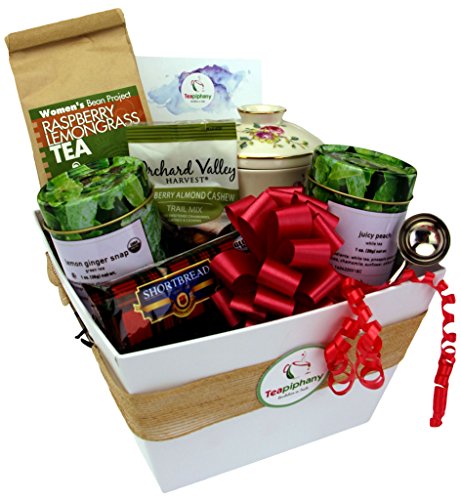This gift basket includes two (1 oz) each, whole leaf teas: Teas Etc Lemon Ginger Snap and Teas Etc Juicy Peach White Tea. This is enough tea to do 20 to 30 - 6 ounce cups of tea. To give a variety of tea, we are also including 6 oz of Women's Bean Raspberry Lemon Grass Tea. Along with tea, we think of having a sweet treat, so we included Scottish Style Shortbread Cookies and Orchard Valley Harvest Cranberry Almond Cashew Trail Mix.