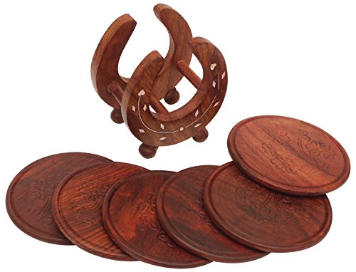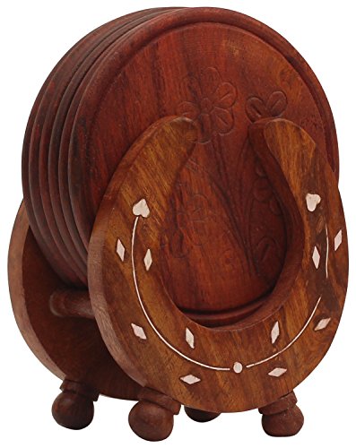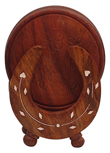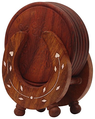 Rosewood Drink Coasters with Horse Shoe Shaped Coaster Holder - SouvNear 3.7" Retro Wood Coaster Set of 6 Round Handmade Brass Inlay Table Coasters & Decorative Wooden Holder for Tea Cups