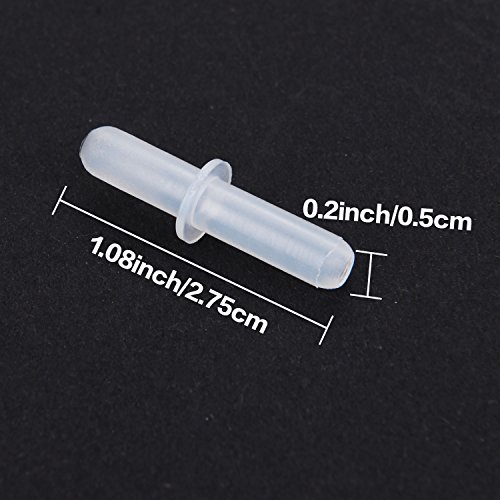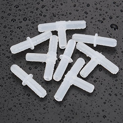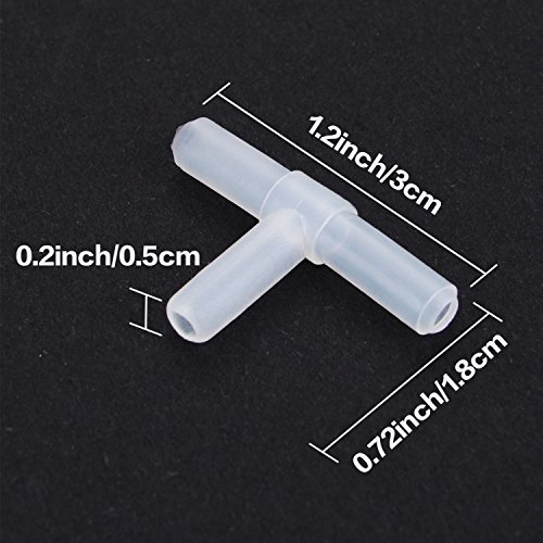 Aquarium tubing connectors size: T-connectors dimension is 1.2 (L) x 0.72 (W) x 0.2 (H) inch/ 30 x 18 x 5 mm and straight connectors is 1.08 (L) x 0.2 (D) inch/ 2.75 x 5 mm