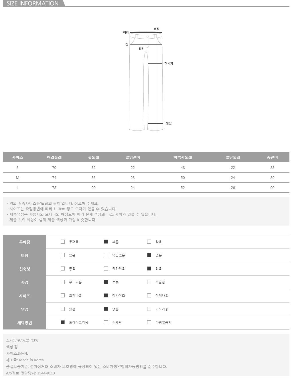 컬러는 청 1color로 구성되어 있으며 모델의 착용 컬러/사이즈는 청/S 입니다. 사이즈는 SML 사이즈로 진행되오니 고객님의 체형에 맞게 선택하셔서 예쁘게 착용하시길 바랍니다.