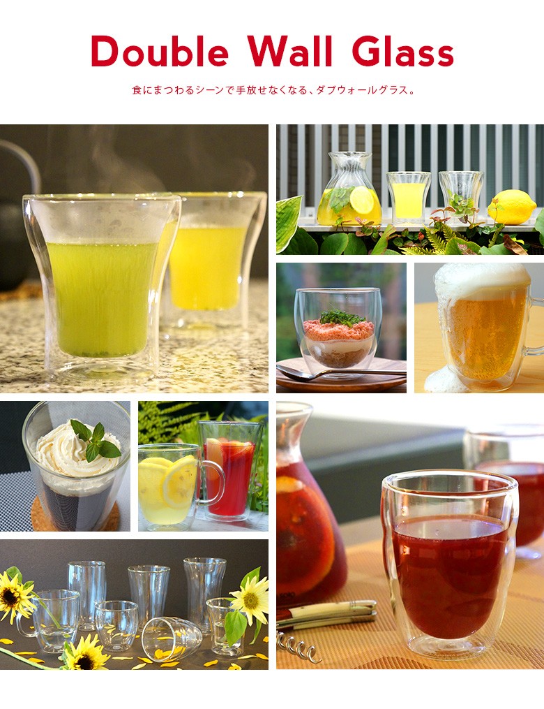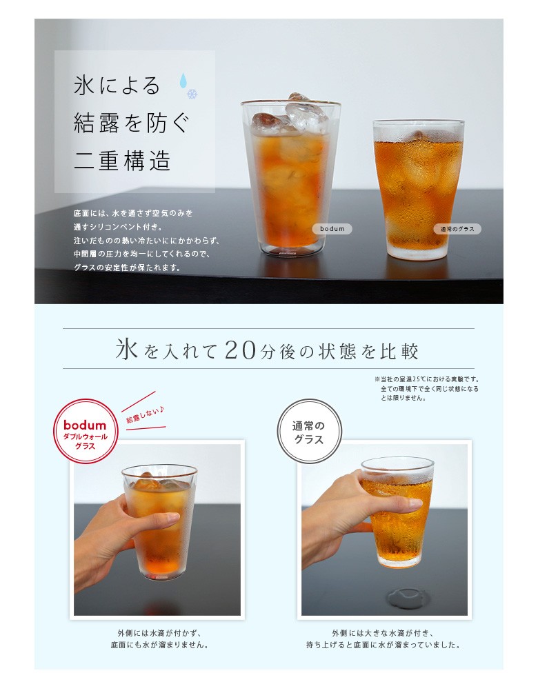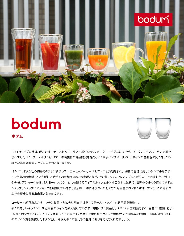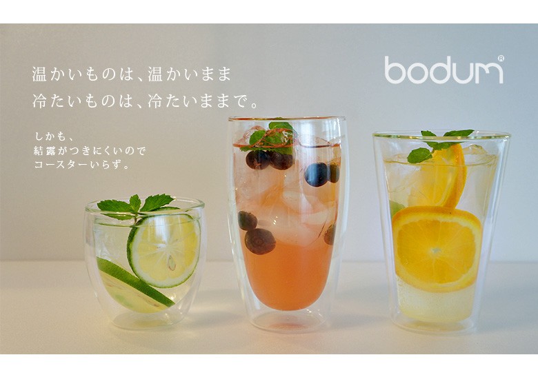 | 商品詳細 | ● bodum ボダム ガラスに熱い飲み物を入れるのは…と思わず抵抗を感じてしまうかもしれません。でもボダムのダブルウォールグラスなら、大丈夫。その秘密は職人の手作業による二重構造にあります。見た目にも飲み物がまるで宙に浮いているように見える不思議なグラス。機能性にも大変優れ、温かいもの、冷たいもの…その飲み物の温度をキープしてくれます。しかも結露も防ぎテーブルを濡らすことはありません。寒い季節に、グラスで温かい飲み物を飲む…なんて、ちょっと素敵な時間を過ごしてみませんか? ![]() | ||
