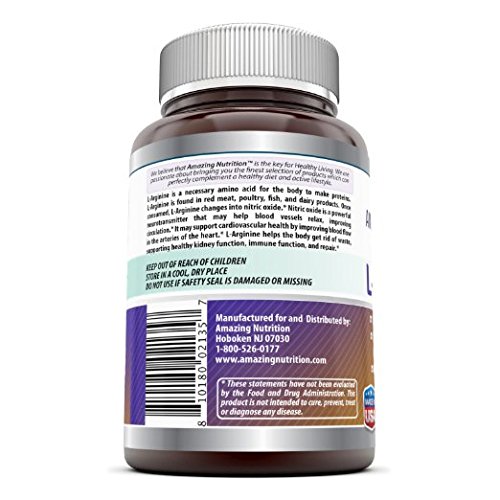 -. Binding : Health and Beauty -. Brand : Amazing Nutrition -. EAN : 0810180021357 -. Feature : ARGININE IN OPTIMAL FORM Don't settle for anything less than the best! Our l-arginine supplement contains l-arginine HCL (hydrochloride), which has been studied extensively and shown to support cardiovascular health and immune system function. Many other arginine supplements don't use this highly effective form! / IDEAL FOR YOUR HEALTHY LIFESTYLE Our l-arginine for women and men is often used as a sports nutrition supplement. Arginine is shown to support the manufacturing of creatine, to support energy production and to help the body produce nitric oxide to increase circulation, all of which can benefit bodybuilders, powerlifters, weightlifters, exercise enthusiasts and athletes / SO EASY TO USE Just one capsule gives you a full 500-milligram dose of pure l-arginine HCL! Make supplementation easy, by choosing Amazing Nutrition L-Arginine 500 mg / THE NUTRIENT YOU NEED WITHOUT THE ADDITIVES YOU DON'T WANT When you choose Amazing Nutrition, you'll get an optimal dose of the amino acid arginine without unnecessary fillers and binders. It's the purer choice for your healthy diet / QUALITY GUARANTEED Our l-arginine 500mg supplement is manufactured in the USA at a facility that adheres to all GMP guidelines. To further ensure purity and safety, our arginine 500mg capsules are third-party tested. As a result, you can choose our l-arginine 500 mg formula with absolute confidence! -. Label : Amazing Nutrition -. Manufacturer : Amazing Nutrition -. PackageQuantity : 1 -. ProductGroup : Health and Beauty -. ProductTypeName : HEALTH_PERSONAL_CARE -. Publisher : Amazing Nutrition -. Size : 250 Capsules -. Studio : Amazing Nutrition -. Title : Amazing Nutrition L-Arginine 500 mg Supplement - Best Amino Acid Arginine HCL Supplements for Women & Man - Promotes Circulation and Supports Cardiovascular Health - 250 Capsules -. UPC : 810180021357