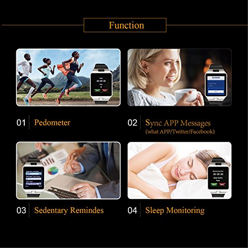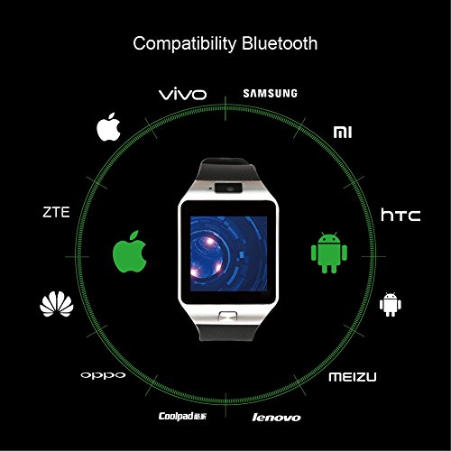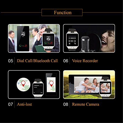 Specifications: - 1.56" tft LCD touch screen 240*240 pixels - external memory:: Support max 32gb tf card - camera: 2m - battery: 380 mah - talk time: 3 hours - standby time: 180 hours - USB port: Mini USB 5pin interface - appearance technology: Stainless steel wire drawing main function: - Phone function: Gsm/gprs 850/900/1800/1900(2g), dial, calling remind, call record, phone book, Bluetooth phone call - Bluetooth function: Bluetooth dialer, call reminder, Bluetooth call, Bluetooth SMS / im message notified - image viewer, sound recorder, audio player(need put and SD card ) - sms: Local sms, phone SMS Bluetooth synchronization - clock display: 3 sets of display clock - pedometer/sedentary remind/sleep monitoring/photograph/alarm clock/ calendar - anti lost: Anti lost remind note: 1.The smart watch is Bluetooth 3.0. All functions support android 4.3 and up smart phones. 2.For IOS iPhone, it just support answer & call, phone book, music play, camera, clock, pedometer, phone anti-lost alert, radio, sleep monitoring, etc. But not support sms(with sim card can be), remote camera control, app. How to connect Bluetooth? 1.Turn on "Bluetooth "on the watch. 2.Click"search new device "on your phone the device name display "w90" 3.Click"yes" on the watch and then click "pair" on your phone through the passcode recognition. 4.Finally, Bluetooth displays the connection successfully. Package included: - 1x dz09 smart watch - 1x USB cable - 1x user manual - 1x screen protector.Feature
