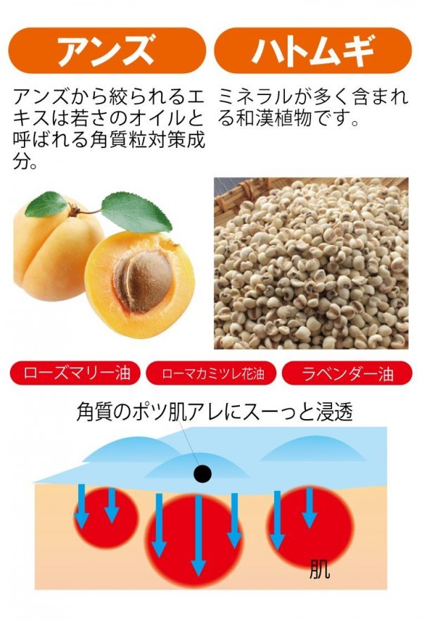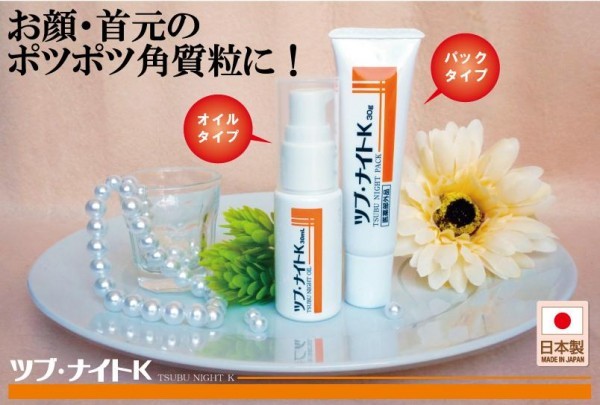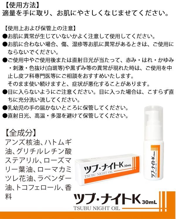 | 大ヒット商品「ツブ・ナイトK」シリーズのオイルバーションが登場!!目の周囲や首元にできつポツポツの肌荒れに、アンズ、ハトムギでしっかりとケア。オイルタイプで肌の広い範囲でお使いいただけます。 |