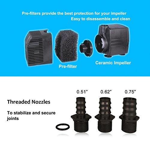 - 3 THREADED NOZZLES(0.51in, 0.62in, 0.75in) - Threaded fittings make it more stable. 4 SUCTION CUP at bottom and 16' CORD, so you can stick it on the right side of the aquarium, either vertically or horizontally