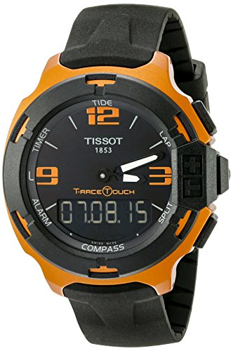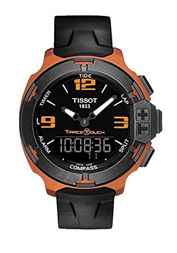 Studio : Tissot Publisher : Tissot Binding : Watch Product Description Burnt orange aluminum case with a black rubber strap. Uni-directional rotating black aluminium bezel. Black dial with luminous hands and index hour markers. Orange Arabic numerals mark the 3, 9 and 12 o'clock positions. Dial Type: Analog. Luminescent hands and markers. Digital perpetual calender. Quartz movement. Scratch resistant sapphire crystal. Solid case back. Case diameter: 42.15 mm. Case thickness: 13.46 mm. Round case shape. Tang clasp. Water resistant at 100 meters / 330 feet. Functions: date, hour, minute, second. Casual watch design. Watch label: Swiss Made. Tissot T-Race Touch Black Dial Orange Rubber Mens Watch T0814209705703. 0