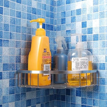 - Keep shampoo, soap and other bath items handy in this corner style suction shower basket