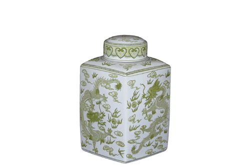 UTC 70648 White Ceramic Jar with Lid with Green Chinese Dragon Accent