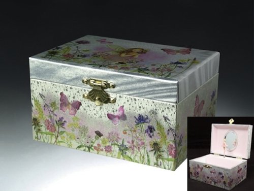 -. Feature : This classic musical jewelry box features a fairy on the lid that lifts up to reveal a twirling ballerina and mirror / 18 note music box plays Swan Lake. / Wood fiberboard Construction. / Dimensions: 5.75" x 3.75" x 5"