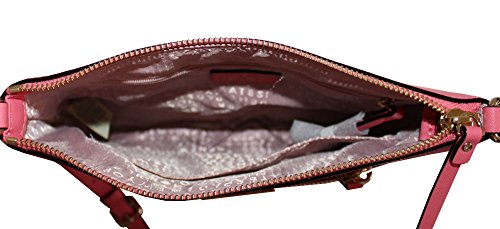 Adjustable crossbody strap, 21"-22.5" drop Top zip closure. Gold tone hardware One outside zip pocket One inside open pocket. one zip pocket Fully lined 10"L X 9.5"H X 1"D color: warm guava