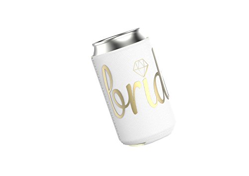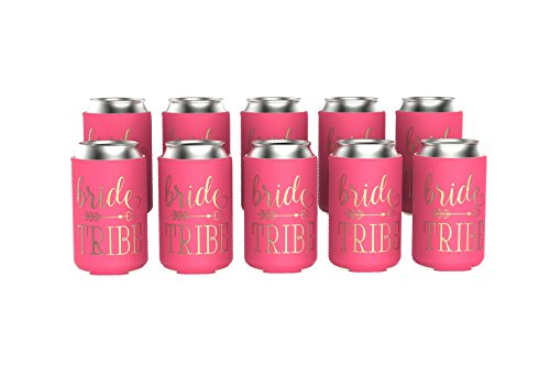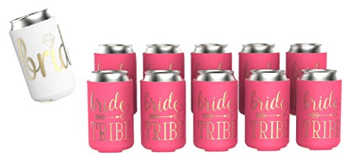11-PIECE Bride Tribe Can Coolers include 10 neon pink bridesmaid coolers and 1 white bride cooler. Neoprene foam features polyester fabric shells double-printed in shimmering gold script.