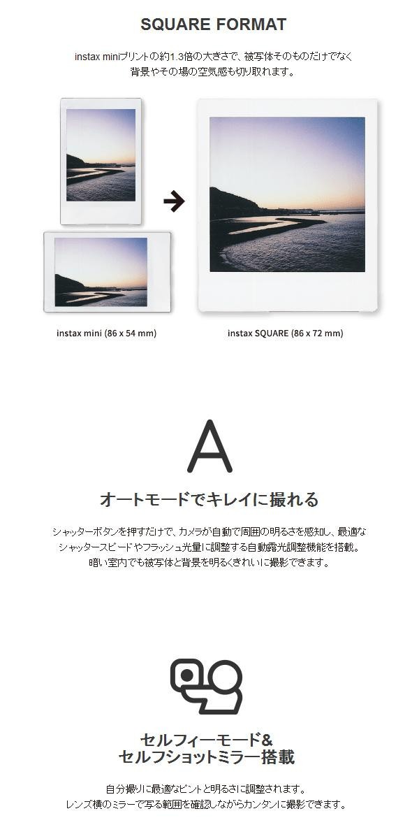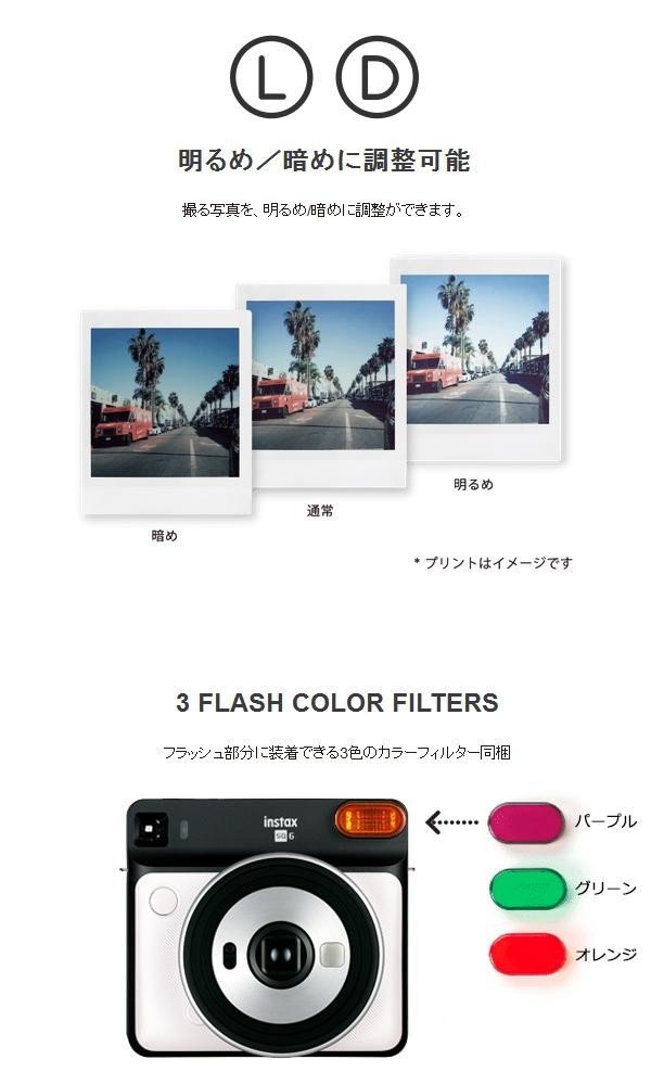 スクエアフォーマットですので、被写体そのものだけでなく背景やその場の空気感も切り取れます。オートモードでキレイに撮れて、自撮りもセルフィーモードとセルフショットミラーで上手に撮れます。フラッシュ部分に装着できる3色のカラーフィルター付きです♪ |