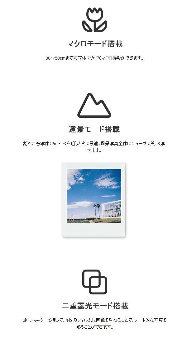 | 付属品 | ショルダーストラップ、フラッシュフィルター×3個、リチウム電池CR2×2本、専用スクエアフィルム1P(10枚)、保証書(保証期間:1年間) |