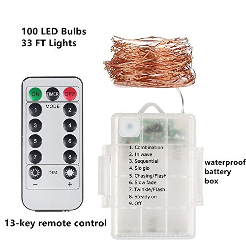 LED String Lights 33ft 100Led Decorative Light 8 Modes Dimmable With Remote Control | Weatherproof Copper Wire Fairy Lights Battery Operated for Indoor,Outdoor,Bedroom,Patio,Garden,Wedding(Warm White)