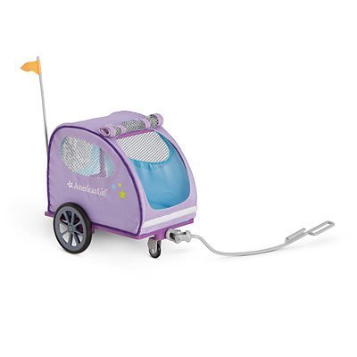 My American Girl® pets can go on a ride behind their doll in this trailer! It features: Nylon fabric and mesh windows over a sturdy plastic frame Roll-up opening that secures with hook-and-loop straps Wheels that roll Bright-orange safety flag Handle can be held for a walk or attached to the Trail Bike