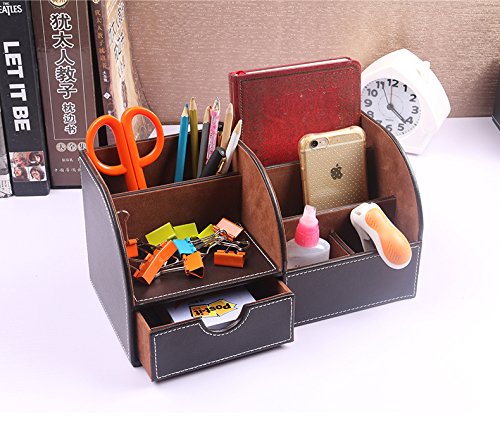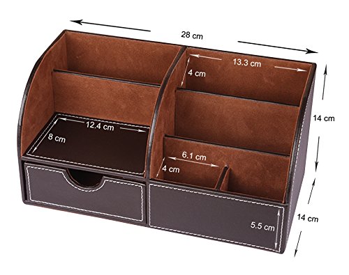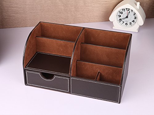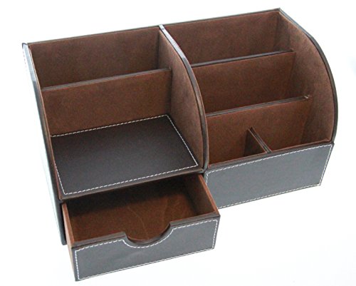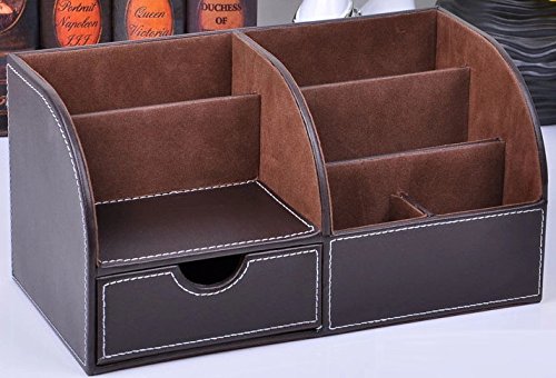 Faux Leather Multi-Function Home and Office Desktop Supplies Stationery Organizer Sorter - Brown Tiered 6-Slot w/ Drawer