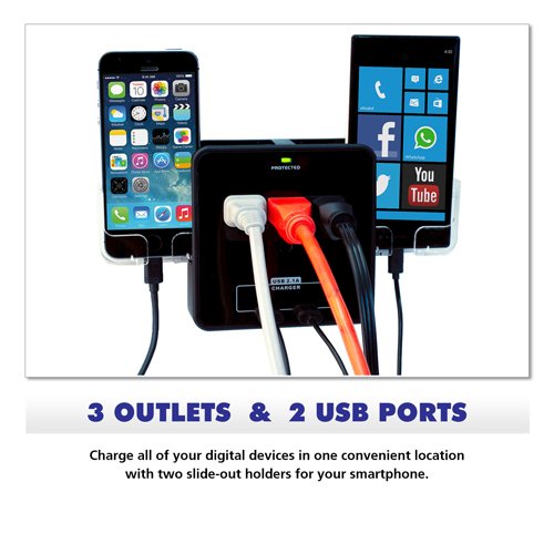 3 AC outlets with 540 joules of surge protection and 2 USB charging ports for simultaneous charging.