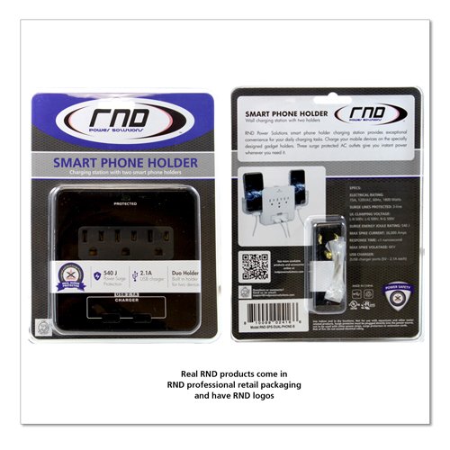 RND Power Solutions smartphone power station provides a convenient solution for your daily charging needs. RND Power Solutions charging station includes three outlets, and two USB ports, allowing you to charge all of your digital devices in one convenient location. Our charging station features a 2-port hub capable of charging 2 USB-powered devices at the same time. USB ports feature a combined 2.1 amps for fast charging of iPads and tablets. RND Power Solutions charging station also has built-in protection against power spikes protecting your devices from overheating. Our charging station securely mounts to any vertical 2-socket outlet or three prong plug in any outlet space. RND Power Solutions charging station includes 2 slide-out holders for your smartphone. The holder work best with phones that have the cable port at the bottom like Apple iPhones and Samsung Galaxy phones. The slide out holders on the sides of our wall charger actually pull open to the side to provide more space to fit your phone with its case on. Just pull them down to rotate them open from a closed position, and then pull the sliders out horizontally to make them wider. These sliders fit most phones and cases, but not all. For example, it will not fit a lot of the Samsung Note Phones even without a case, and will fit the iPhone 6 Plus but only with a very thin case on.